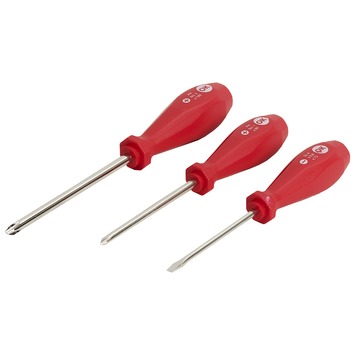 De 3-delige OK-schroevendraaierset sleuf-Phillips bestaat uit 3 stevige schroevendraaiers, gemaakt van chroom-vanadiumstaal. De 3 schroevendraaiers zijn geschikt voor Phillips-kruiskopschroeven met maat PH1 en PH2 en sleufkopschroeven. De 3-delige set bestaat dan ook uit een Phillips-1-kruiskopschroevendraaier, een Phillips-2-kruiskopschroevendraaier en een sleufkopschroevendraaier. Deze schroevendraaier voor sleufkopschroeven heeft een afmeting van 100mm bij 5mm. De 3 schroevendraaiers uit deze set, zowel de schroevendraaier met platte kop als de schroevendraaiers met Phillips-kruiskoppen, hebben kunststof handgrepen waarmee de schroevendraaiers makkelijk te hanteren zijn. Bekijk GAMMA’s assortiment wanneer u op zoek bent naar een andere schroevendraaierset.