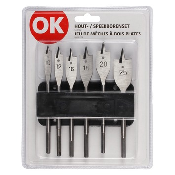 De OK speedborenset is uitermate geschikt om te boren in hard -en zacht hout. De boren beschikken over een voorsnijder en een zeskante kolf waarmee nauwkeurig (grotere)gaten geboord kunnen worden. De set bestaat uit een zestal speedboren in de maten 10, 12, 16, 18 en 20 en 25mm. De speedboren kunnen in een (accu)schroefboormachine gebruikt worden.