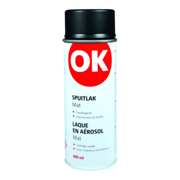 OK spuitlak zwart mat is een sneldrogende alkyd lak voor ondergronden van hout, metaal, aluminium, glas, steen en diverse soorten kunststof. Ideaal voor moeilijk te schilderen oppervlakken zoals buizen, rotan en spijlen. Voor een optimale hechting wordt aangeraden vooraf OK spuitlak primer aan te brengen. Deze spuitlak is zowel binnen als buiten te gebruiken. Eén spuitbus van 400 ml volstaat voor het spuiten van een oppervlakte van 1,5 tot 2 m2. Stofdroog na 15 minuten.