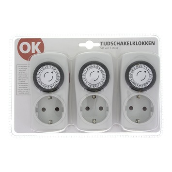 Programmeer uw apparaten of verlichting met deze OK tijdschakelklok vaste ruiters met dagprogramma. Deze OK schakelklok schakelt uw apparaten of verlichting per 30minuten. Wordt geleverd in een verpakking van 3 stuks. Het maximaal belastbaar vermogen is 3500W.