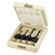 Deze 4-delige OK verzinkborenset van GAMMA bestaat uit een handig kistje met een verstelbare verzinkkroon en verzinkboren in de maten 3-4-5-6mm. De verzinkborenset is geschikt voor het nabewerken van geboorde of geponste gaten in hout. Het verzinken van een gat dient bijvoorbeeld om een gaatje op maat voor verzonken schroeven te maken, zodat deze gelijk met het materiaal of iets lager in het materiaal valt. Ook maakt een verzinkt gat het mogelijk dat gloeiende klinknagels gemakkelijker in het gat kunnen worden gestoken. In de praktijk wordt een gat ook vaak iets verzonken om het af te bramen. Deze 4-delige verzinkborenset is daarmee een uitstekende aanvulling op uw gereedschapsset.