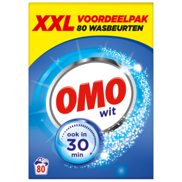 Deze doos met Omo waspoeder is goed voor 80 wasbeurten van witte was. Het is vooral effectief tegen witte was met veel vlekken van de stoffen katoen, polyester en bedlinnen.