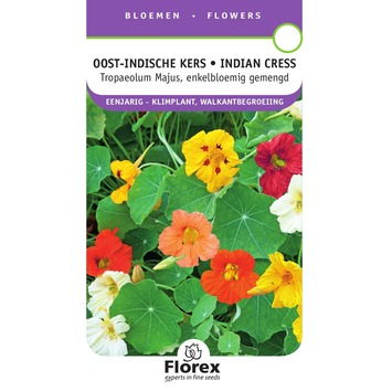 Oost-indische kers (Tropaeolum Majus, enkelbloemig gemengd) Sterke klimplant en ook geschikt voor begroeiing van taluds en walkanten. De Oost-indische kers Zaadjes bloeien in April, Mei. Dit is een Eenjarig plant Deze zaadjes kunnen gepland worden in April, Mei en ontkiemen in 10-15 dagen.