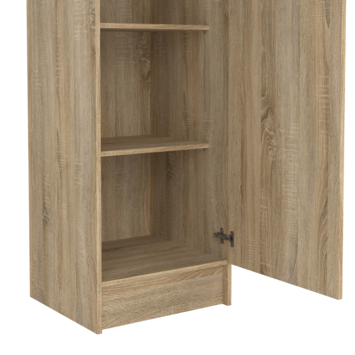 Achter de deur bevinden zich vier legplanken en een roede. Hiermee berg je zowel hangende kleding als gevouwen textiel en accessoires overzichtelijk op. Dankzij het compacte formaat neemt de kast weinig ruimte in beslag, terwijl hij toch veel bergruimte biedt.
