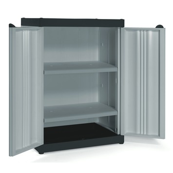 Met deze Opbergkast kunststof met 2 legborden zwart met grijs De opbergkast met van 90x65x45cm met twee legborden biedt genoeg ruimte voor al uw schoonmaakmiddelen. Kortom, met deze simpel opberger kan een kleine ruimte er toch opgeruimd uitzien.