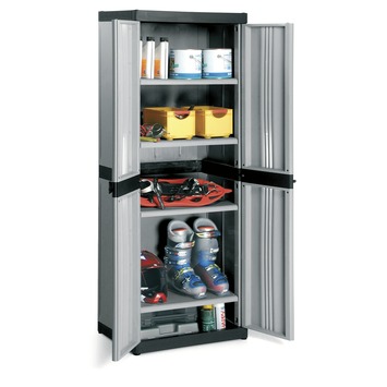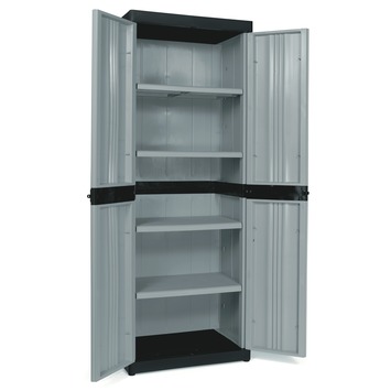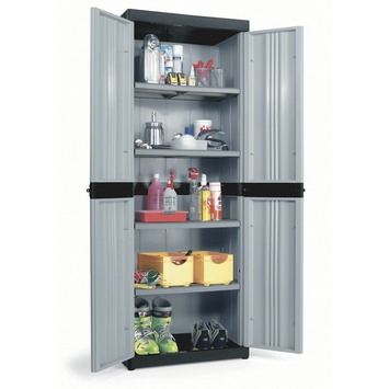 De Opbergkast kunststof met 4 legborden zwart met grijs de ideale opberger. Deze kast voor in de garage of een tuinhuis met afmetingen van 174X65X45cm is geschikt voor het opbergen van al uw materieel gerief. De uitkomst voor het opbergen van al uw materieel gerief.