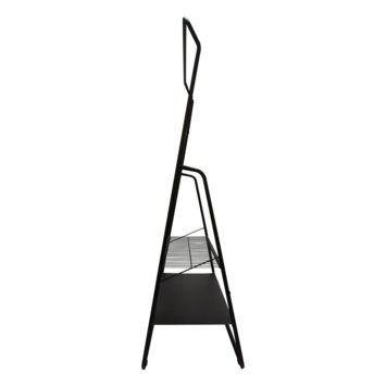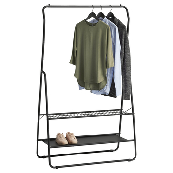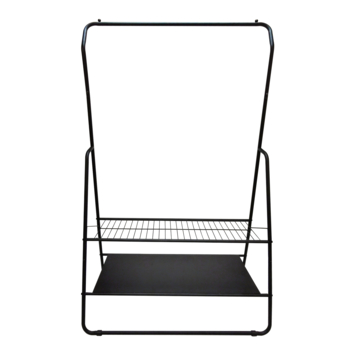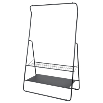 Het kledingrek Fenna is het ideale rek om kleding aan op te hangen. Hij is gemaakt van zwart metaal en heeft daarom een strakke eigentijdse uitstraling. Met 2 rekjes onder het hanggedeelte kan je ook nog schoenen of andere accessoires kwijt. Het perfecte rek om jouw mooiste kledingstukken te laten zien.