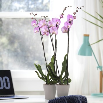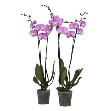 Deze Orchidee heeft roze blaadjes met kleine witte blaadjes in het midden. Voluit heet deze plant de Phalenopsis Luxor Orchidee, maar wordt ook wel de Vlinderorchidee genoemd. Je besteld deze plant per 2 stuks en beide orchideeën hebben een hoogte tussen de 60-70 cm en een potmaat van 11 cm in diameter. De plant heeft een bijzonder lange bloeiduur, wat deze orchidee een perfecte kamerplant maakt.