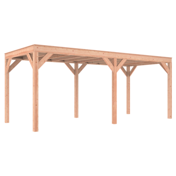 De overkapping is gemaakt van onbehandeld Douglas hout. Deze houtsoort is van nature sterk en gaat zonder extra behandeling eenvoudig 10 tot 15 jaar mee. Wil je de levensduur verlengen, dan kun je het hout behandelen met Douglas beits of Douglas olie en dit elke 2 jaar herhalen.