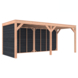 De Overkapping Douglas Zwart Zweeds Rabat 595 x 255 cm biedt een ruime, beschutte plek in de tuin. De constructie is gemaakt van onbehandeld Douglas hout en de wanden zijn afgewerkt met zwart Zweeds rabat. Met een doorloophoogte van 224 cm is er voldoende ruimte om comfortabel onder de overkapping te staan.