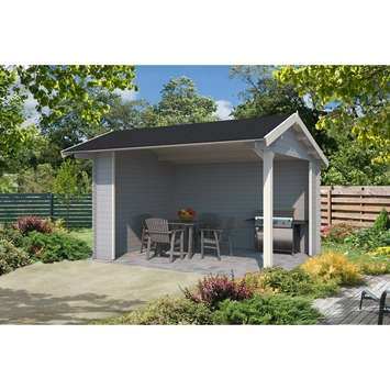 Het houten tuinhuis met overkapping heeft verschillende los verkrijgbare accessoires. Wanneer je de overkapping wilt schilderen is het slim om eerst advies bij een verfspecialist te vragen. Het hout moet namelijk vochtregulerend blijven en dus niet afgedicht worden. Daarnaast is een sterke UV bescherming ook van toegevoegde waarde.