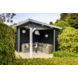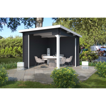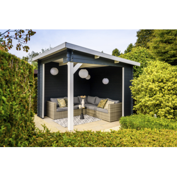 Het houten tuinhuis met overkapping heeft verschillende los verkrijgbare accessoires. Wanneer je de overkapping wilt schilderen is het slim om eerst advies bij een verfspecialist te vragen. Het hout moet namelijk vochtregulerend blijven en dus niet afgedicht worden. Daarnaast is een sterke UV bescherming ook van toegevoegde waarde.