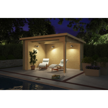 De overkapping is gemaakt van geschaafd vurenhout en wordt onbehandeld geleverd. De wanden hebben een dikte van 28 mm en worden opgebouwd met de stapelbouwmethode. Daarbij schuif je de planken met tand- en groefverbinding en kruisverbanden stevig in elkaar, zonder gebruik van steunpilaren. Dit maakt de montage overzichtelijk en goed te doen voor de gemiddelde klusser. Het dak loopt schuin af en voert regenwater aan de achterzijde af. De overkapping kan gespiegeld worden opgebouwd, waarbij de dichte zijde links of rechts geplaatst kan worden.