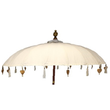 De prachtige handgemaakte parasol Bali wit is versierd met franjes en hartjes. De stok en de top van de parasol is decoratie versierd houtsnijwerk. Deze parasol is een echte sfeermaker!