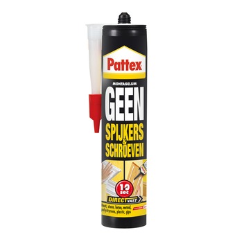 De Pattex Geen-Spijkers-Geen-Schroeven 400 gram is een montagelijm voor een muurvaste bevestiging zonder gereedschap. De Pattex Geen-Spijkers-Geen-Schroeven 400 gram is oplosmiddelvrij en is geschikt voor binnen gebruik.