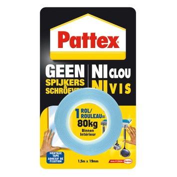 De Pattex Geen-Spijkers-Geen-Schroeven Montagetape 8kg binnen is een dubbelzijdige tape voor het muurvast bevestigen van diverse toepassingen zonder gebruikt van gereedschap. De Pattex Geen-Spijkers-Geen-Schroeven is oplosmiddelvrij en is geschikt voor binnen gebruik.