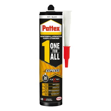 Pattex One For All Express is een snel drogende montagekit, geschikt voor het lijmen en afdichten van alle materialen, onder alle omstandigheden. Extra flexibel. Extreem hoge eindsterkte. Overschilderbaar.