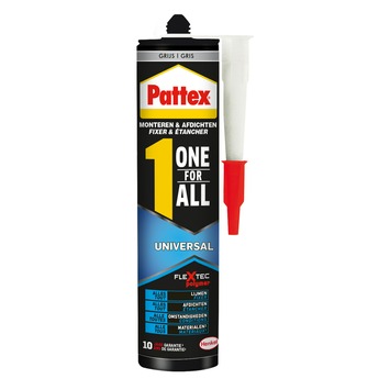 Pattex One For All Universal is een hoogwaardige montagekit geschikt voor het lijmen en afdichten van alle materialen, onder alle omstandigheden. Grijs. Extra flexibel. Extreem hoge eindsterkte. Overschilderbaar.