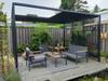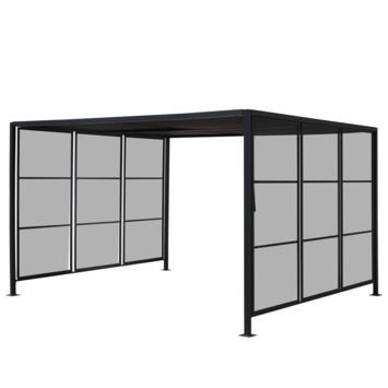 Het paviljoen beschikt over een schuifbaar dak een zonwerend doek, hiermee kun je schaduw creëren waar je maar wilt. Deze tuinpaviljoen is voorzien van een stevig staal gecoat frame met poten van 5x5 cm. De nokhoogte is 210 cm.