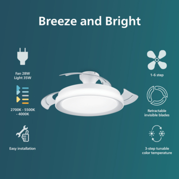 De witte Philips Bliss LED-plafondlamp combineert verlichting met een uitschuifbare ventilator voor een verfrissend briesje. Met SceneSwitch stel je via je bestaande lichtschakelaar de lichtsterkte in op 100%, 40% of 10% en creëer je eenvoudig de juiste sfeer.