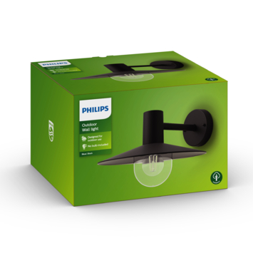 De Philips buitenlamp Skua is een retro-design lamp die geheel van deze tijd is. Het hoogwaardige aluminium armatuur in het zwart is ontworpen met een beschermingsniveau van IP44 (spatwaterdicht). Zijn lichtbron is goed zichtbaar waardoor de Philips buitenlamp Skua uitermate geschikt is voor een decoratieve LED-filament lichtbron. Kies uit ons ruime assortiment lichtbronnen en maak de wandlamp direct af.