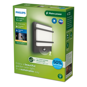 De Philips Petronia LED-buitenwandlamp heeft een lichtpaneel in een antracietgrijs aluminium frame met bewegingssensor. Deze lamp behoort tot de categorie Ultra Efficient-buitenlampen die gebruik maakt van innovatieve technologie om aanzienlijk meer energie te besparen en materiaalverspilling te verminderen. Met een indrukwekkende levensduur van 50.000 uur overtreffen deze lampen de standaard LED-buitenlampen van Philips met meer dan twee keer en verminderen het energieverbruik met 50%