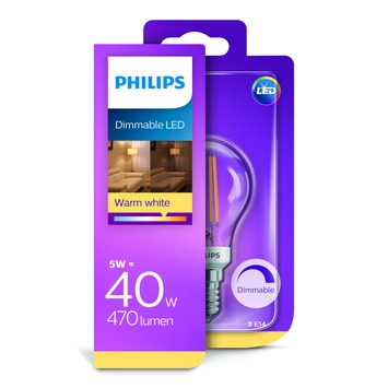 De Philips classic LEDlamp E14 40 watt warm wit dimbaar is een peervormige lamp geschikt voor een E14 fitting. De LED-lamp geeft een sprankelend lichteffect in een warm witte kleur. Hierdoor brengt deze LED-peerlamp sfeer in elk interieur. De LED-lamp heeft een vermogen van 5 watt (vergelijkbaar met een gloeilamp van 40 watt) en is energiezuinig. De LED-lamp is direct na inschakelen op volle sterkte. Doordat de lamp dimbaar is kan de lichtsterkte worden afgesteld. Kortom, de Philips LED-lamp classic is een prettige verlichtingsbron.