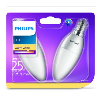 De Philips duopack kaarslamp LED E14 25 watt is een goede vervanging van de gloeilamp en kan uitstekend gebruikt worden in kroonluchters met een E14 fitting. Deze LED-lamp heeft een wattage van 4 watt. Dit is vergelijkbaar met een gloeilamp van 25 watt. De LED-lamp heeft een warm witte kleur en geeft een helder maar sfeervol licht. Het voordeel is dat de LED-lamp een stuk energiezuiniger is dan de traditionele gloeilamp. Ook heeft de LED-lamp een langere levensduur. De Philips LED-kaarslamp komt in een handig voordeelpak van 2 stuks. Kortom, de Philips LED-kaarslamp is een prettige verlichtingsbron.