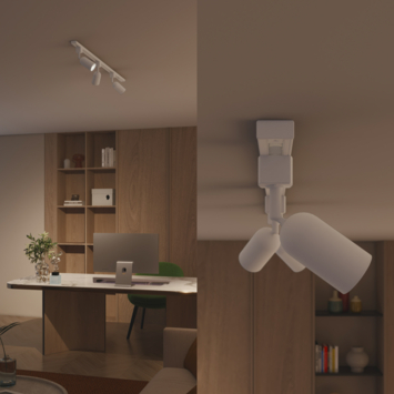 Dankzij het draaibare en kantelbare ontwerp richt je de spots moeiteloos op plekken die extra verlichting nodig hebben. Zo licht je een kunstwerk uit zet je een vaas in de schijnwerpers of voorzie je een werkplek van helder licht. De starterkit is gemaakt van wit metaal dat zorgt voor een moderne uitstraling en een minimalistisch ontwerp dat goed tot zijn recht komt in uiteenlopende interieurs.
