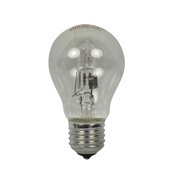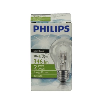 De Philips EcoClassic halogeenlamp E27 28W helder is een peervormige halogeenlamp, geschikt voor een E27 fitting. De lamp heeft een vermogen van 28 watt, hiermee heeft de lamp een lichtopbrengst van 370 lumen. Het heldere, warmwitte licht van deze lamp heeft een natuurlijke uitstraling waarin de kleuren van uw interieur goed tot hun recht komen. Ook heeft de lamp een levensduur van 2000 uur, twee keer zo lang als een standaard lamp. Met deze lamp heeft u dus sprankelend licht in de vertrouwde vorm, met een langere levensduur. De lamp schijnt direct met maximale helderheid. Tevens kunt u de lamp dimmen, waardoor u gemakkelijk de hoeveelheid licht kunt bepalen.