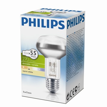 De Philips EcoClassic reflectorlamp R63 E27 42W is een halogeen lamp van 42W geschikt voor een grote fitting. Doordat de lamp dimbaar is, kunt u het licht van deze lamp variëren van helder en sprankelend naar warm en gezellig. Bovendien creëert de reflector een heldere, gerichte lichtbundel. Handig voor het accentueren van objecten of als leeslamp. Veelzijdigheid is dus een belangrijke eigenschap. Daarnaast heeft deze lamp een levensduur van 2000 uur en gaat dus 2 keer langer mee dan een standaardlamp. Met de Philips EcoClassic reflectorlamp R63 E27 42W heeft u dus een veelzijdige maar ook een economisch voordelige lamp.