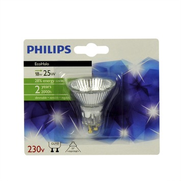 De Philips EcoHalo spot GU10 18W warm wit is een halogeenspot geschikt voor een GU10 fitting. De spot heeft een vermogen van 18 watt, hiermee heeft de spot een lichtopbrengst van 105 lumen. Het heldere, warmwitte licht van deze spot heeft een natuurlijke uitstraling waarin de kleuren van uw interieur goed tot hun recht komen. Dankzij de reflector creëert de spot gerichte, heldere lichtbanen, waardoor u gemakkelijk lichtaccenten kunt aanbrengen. De spot heeft een lichthoek van 25 graden. Ook heeft de spot een levensduur van 2000 uur, twee keer zo lang als een standaard lamp. De spot schijnt direct met maximale helderheid. Tevens kunt u de spot dimmen, waardoor u zelf gemakkelijk de hoeveelheid licht kunt bepalen.