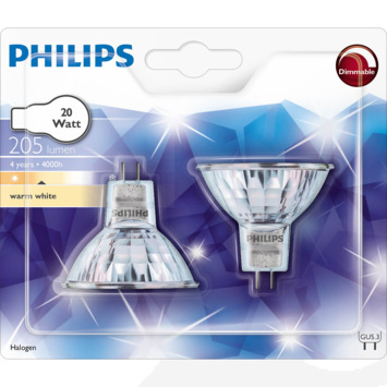 De Philips halogeenspot GU5.3 20W 12V warm wit 2 stuks zijn halogeenspots geschikt voor een GU5.3 fitting. De spots hebben een vermogen van 20 watt, hiermee hebben de spots een lichtopbrengst van 205 lumen. Het heldere, warmwitte licht van deze spots heeft een natuurlijke uitstraling waarin de kleuren van uw interieur goed tot hun recht komen. Dankzij de reflectoren creëren de spots gerichte, heldere lichtbanen, waardoor jegemakkelijk lichtaccenten kunt aanbrengen. De spots hebben een lichthoek van 36 graden. Ook hebben de spots een levensduur van 2000 uur, twee keer zo lang als andere lampen. De spots schijnen direct met maximale helderheid. Tevens kunt jede spots dimmen, waardoor jezelf gemakkelijk de hoeveelheid licht kunt bepalen. De spots zijn per twee stuks verpakt.