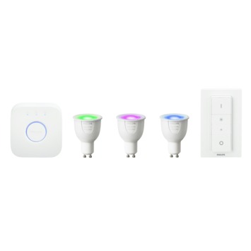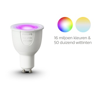 De Philips LED Hue color set is nu beschikbaar in de kleuren rood, groen, blauw en wit. Deze lamp is duurzaam met de LED technologieën van nu. Deze verlichtingsbron heeft een lange levensduur en zorgt ervoor dat je kunt besparen op energiekosten. De Philips LED lamp heeft een kleurtemperatuur van 3000 kelvin en een wattage van 6,5 watt. Ook is deze lamp dimbaar. Het is een ideaal product om te zorgen voor een goed zicht in bijvoorbeeld winkels of kantoren, maar ook om een gezellige sfeer te creeren in de woonkamer met leuke kleuren.. Deze verlichtingsbron heeft een GU10 fitting en past in armaturen met dezelfde fitting. Kortom, de Philips LED Hue color set is een prettige verlichtingsbron.
