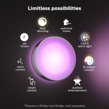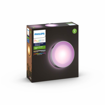 De Philips Hue Daylo white and color ambiance muurlamp in roestvrij staal geeft licht aan twee kanten. De ronde lamp werpt een cirkel van subtiel achtergrondlicht tegen de muur en aan de voorkant zorgt hij voor een zacht en mooi lichteffect. De ingebouwde LED-lamp geeft 16 miljoen kleuren en 50.000 wittinten. Door de slimme lamp te koppelen met je Philips Hue Bridge ontstaan er nieuwe mogelijkheden. De bediening gaat nu gemakkelijk en eenvoudig met smartphone of tablet via de Hue app, ook als je niet thuis bent. Bovendien kun je timers en lichtscènes instellen. En je kunt gebruik maken van geofencing. Dat betekent dat je buitenverlichting automatisch aangaat als het je het huis nadert. De lamp is weerbestendig met een IP44-classificatie, dus je hoeft je geen zorgen te maken over regen en wind.