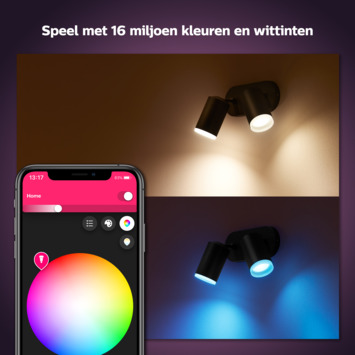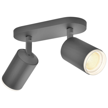 De 2-lichts Philips Hue LED opbouwspot uit de serie Fugato, is een energiezuinig alternatief voor de halogeenspot en heeft een lange levensduur. De opbouwspots zelf zijn zwart gekleurd en zijn gemaakt van metaal. De verlichtingsbron heeft een lichtopbrengst van 350 lumen en een maximale wattage van 6 watt. Dit product is ideaal om een aangename sfeer te creëren in het woonvertrek. Dit kun je doen door de lichtkleur in te stellen met je telefoon of tablet. De spots zijn richtbaar en kun je deze richten op objecten of meubilair waar jij nadruk op wilt leggen. De beschermingswaarde van dit product is IP20. Dat houdt in dat het product stofdicht is. Kort gezegd, de Philips Hue opbouwspot is een prettige verlichtingsbron voor in huis.