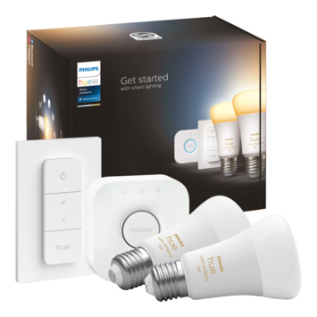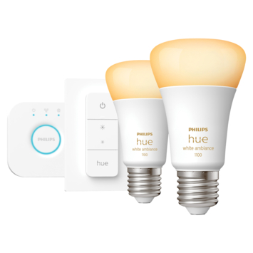 Verander je huis in een smart home met de Philips Hue starterkit, inclusief dimmer switch. Deze kit bevat twee Hue White ambiance standaardlampen met E27-fitting waarmee je kunt genieten van prachtig LED-licht in elke wittint die je maar wil. Stel warmwit licht in als je wil ontspannen, koelwit licht als je meer focus nodig hebt of dim het licht voor een gezellige avond. De lampen schijnen met 1100 lumen, wat vergelijkbaar is met een oude gloeilamp van 75 W. In de doos vind je verder alles wat je nodig hebt om je woning te verrijken met slimme verlichting, waaronder een superhandige Hue dimmer switch. Gebruik deze slimme schakelaar om je lampen aan en uit te doen, te dimmen of feller te zetten. Je kunt de dimmer switch gemakkelijk overal ophangen, bijvoorbeeld op de plek van een bestaande lichtknop. Je kunt hem zelfs van de magnetische wandhouder halen en bij je dragen als afstandsbediening. De starterkit is natuurlijk compleet met een Hue Bridge. Daarmee krijg je toegang tot alle slimme verlichtingsfuncties zoals timers, automatiseringen, bediening als je niet thuis bent.