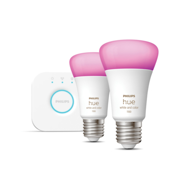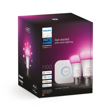 Verander je huis in een smart home met de Philips Hue starterkit. Deze kit bevat twee Hue White ambiance and color standaardlampen met E27-fitting waarmee je kunt genieten van prachtig LED-licht in elke kleur die je maar wil. Stel koelwit licht in als je meer focus nodig hebt om te werken, warmwit licht om te ontspannen of kies een van de 16 miljoen prachtige kleuren. De lampen schijnen met 1100 lumen, wat vergelijkbaar is met een oude gloeilamp van 75 W. In de doos vind je verder alles wat je nodig hebt om je woning te verrijken met slimme verlichting, waaronder een superhandige Hue Bridge.