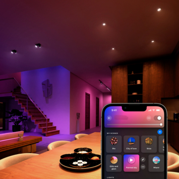 Deze Philips Hue starterkit bestaat uit drie slimme White and color ambiance LED-spots met GU10-fitting, een Philips Hue Bridge en een dimmer switch. Gebruik deze slimme schakelaar om je lampen aan en uit te doen, te dimmen of feller te zetten. Neem de lichtbediening helemaal in eigen hand en kies uit 16 miljoen kleuren en 50.000 wittinten om in elke kamer de perfecte sfeer te creëren. Kies warmwit licht om te ontspannen en gebruik koelwit licht voor meer focus. De lampen passen in je bestaande spots en verbind je met de Hue Bridge met de Philips Hue app. Dan kun je eindeloos veel verlichtingsmogelijkheden ontdekken, zoals het personaliseren van lichtscènes, synchroniseren met muziek, timers instellen en voeg accessoires toe, zoals bewegingssensoren en slimme draadloze schakelaars.