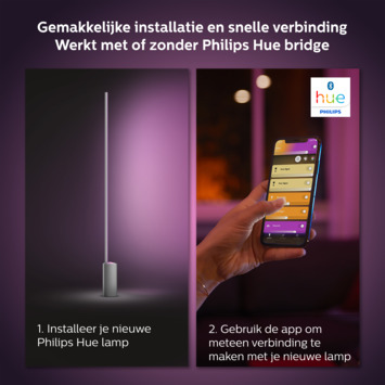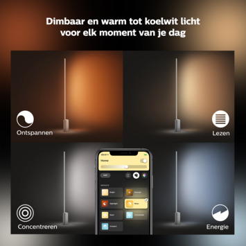 De Philips Hue vloerlamp uit de serie Signe, is een stijlvolle lamp die je makkelijk kunt verplaatsen. De lamp bevat geïntegreerde LED als lichtbron. Led is energiezuinig en heeft een lange levensduur. De tafellamp zelf heeft een grijze kleur en is gemaakt van aluminium. Met een maximaal kleurtemperatuur van 6500 kelvin, is het mogelijk om zelf de gewenste lichtkleur in te stellen met je smartphone of tablet. De lamp heeft een grote lichtopbrengst van 2500 lumen. De energieklasse waar de lamp onder valt is A. Dit is een van de meest zuinige energieklasses.