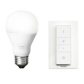 Deze Philips Hue E27 dimmerset bestaat uit een dimbare LED-lamp van 9,5 watt met een sterkte van 800 lumen. En een schakelaar die u op de muur kan schroeven of plakken met wat dubbelzijdig tape. De schakelaar is magnetisch en kan uit het paneel gehaald worden om te gebruiken als afstandbediening waarmee u overal in de kamer de Hue-lampen aan en uit kan zetten of dimmen. De schakelaar kan tot 10 Hue-dimbare lampen besturen en met de Hue-bridge kunt u uw set nog verder uitbreiden. De dimbare Hue-lampen van Philips zijn ook heel energiezuinig en vallen in energieklasse A++.