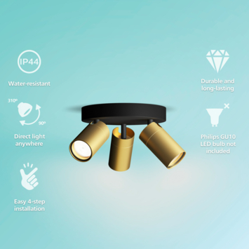 De Philips Idris plafondspots hebben een modern, strak en watervast ontwerp en zijn daardoor geschikt voor de badkamer en andere ruimtes in huis. Het goudkleurige, minimalistische design past goed bij verschillende interieurstijlen.