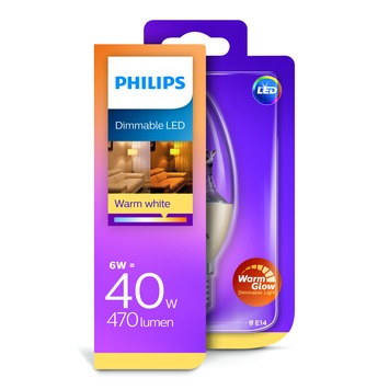De Philips kogellamp LED E14 6 watt dimbaar is een kaarsvormige lamp geschikt voor een E14 fitting. De lamp heeft een innovatief design en geeft een helder, sprankelend lichteffect. Door de mooie uitstraling van de lamp is deze uitermate geschikt voor decoratieve verlichting. De lamp is daarnaast WarmGlow dimbaar. Hoe meer je het licht dimt, hoe warmer de lichtkleur wordt. Dat maakt deze lamp uitermate geschikt voor verschillende doeleinden. Gebruik helder wit licht om mee te werken en creëer 's avonds de gewenste sfeer in huis door de lamp naar warm licht te dimmen. Kortom, de Philips dimbare kogellamp is een prettige lichtbron.
