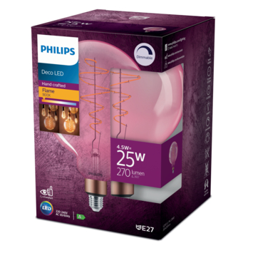 Met deze Philips LED filamentlamp zorgt u voor extra sfeer in huis. Ze zorgen voor een stijlvol lichtelement en geven sfeervol warmwit licht. Deze lamp heeft een roze coating en in de lamp zie je een dimbare lichtspiraal, wat doet denken aan gloeilampen van vroeger. Met EyeComfort, voor licht dat aangenaam is voor uw ogen. De lamp heeft een E27-fitting, en past dus in de meeste lampen met grote fitting.