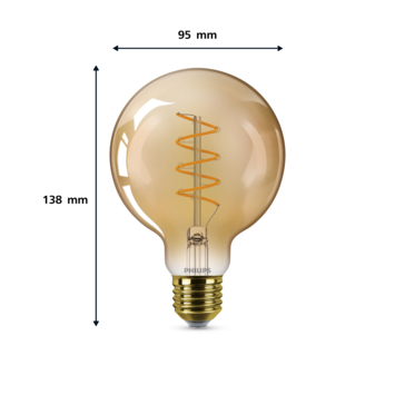 Met deze Philips LED filamentlamp zorg je voor extra sfeer in huis. Ze zorgen voor een stijlvol lichtelement en geven sfeervol warmwit licht. Deze lamp heeft een gouden coating en in de lamp zie je een dimbare lichtspiraal, wat doet denken aan gloeilampen van vroeger. Met EyeComfort, voor licht dat aangenaam is voor jouw ogen. De lamp heeft een E27-fitting, en past dus in de meeste lampen met grote fitting.