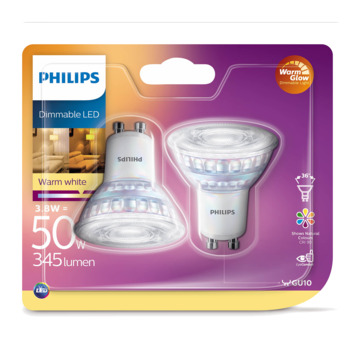 De 2-pack Philips Led lamp is een energiezuinig alternatief voor de halogeenlamp, gloeilamp en de spaarlamp. Led verlichting heeft een lange levensduur en je bespaart meer op jouw energiekosten. De verlichtingsbron heeft een lichtopbrengst van 345 lumen en een kleurtemperatuur van 2700 kelvin. Met een warm witte lichtkleur, kun jij een aangenaam warme sfeer creëren in het woonvertrek. De lamp bevat een GU10 fitting en een wattage van 50 Watt. De energieklasse waar deze lamp onder valt is A+. Dit is een van de meest zuinige energieklasse. Kort gezegd, deze verlichtingsbron is prettig voor in het woonvertrek.