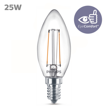 Vervang je oude kaarslamp met een nieuwe energiezuinige Philips LED-lamp, met warmwit licht. Deze lampen verbruiken circa 80% minder energie dan traditionele lampen dankzij de nieuwste energiezuinige LED-technologie en ze gaan tien keer langer mee. Met EyeComfort, voor licht dat aangenaam is voor jouw ogen. Deze lampen hebben een E14-fitting en zijn vaak geschikt voor tafellampen of lusters.