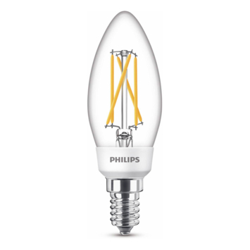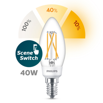 Met de Philips SceneSwitch kaars LED-lamp kunt u met uw bestaande schakelaar eenvoudig het lichtniveau aanpassen, van helder licht naar natuurlijk licht of een sfeervolle, warme gloed. U hebt geen dure dimmer of aanvullende installatie nodig. Bovendien heeft deze lamp een geheugenstand; daardoor onthoudt de lamp de laatste lichtstand, wanneer u de lamp voor langere tijd heeft uitgeschakeld. Met EyeComfort, voor licht dat aangenaam is voor uw ogen. Deze kleine lamp heeft een E14-fitting, en is vaak geschikt voor tafellampen met kleine fitting.