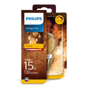 Het kogel gevormde filament van Philips bevat Led verlichting. Led is energiezuinig en heeft een lange levensduur. Ook bespaar je op je verlichtingskosten door het minder verbruiken van energie. De lichtbron heeft een lichtopbrengst van 136 lumen en een kleurtemperatuur van 2000 kelvin. Dit is te vergelijken met kaarslicht. Hiermee kun je een aangenaam warme sfeer creëren in de woon- of slaapkamer. De lamp is ook te dimmen met een lichtschakelaar. De lamp heeft een E14 fitting en past hiermee in armaturen met een kleine fitting. De verlichtingsbron heeft een wattage van 3.5 Watt en valt onder energieklasse A. Dit is één van de meest zuinige energieklasses.