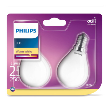Het 2-pack kogel gevormde filament van Philips bevat Led verlichting. Led is energiezuinig en heeft een lange levensduur. Ook bespaar je op je verlichtingskosten door het minder verbruiken van energie. De lichtbron heeft een lichtopbrengst van 250 lumen en een kleurtemperatuur van 2700 kelvin. Dit is een warm witte lichtkleur. Hiermee kun je een aangenaam ontspannen sfeer creëren in de woon- of slaapkamer. De lamp heeft een E14 fitting en past hiermee in armaturen met een kleine fitting. De verlichtingsbron heeft een wattage van 2.2 Watt en valt onder energieklasse A++. Dit is één van de meest zuinige energieklasses.